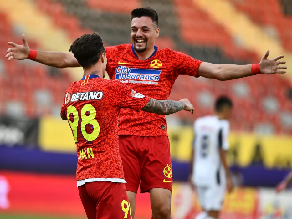 Dennis Man se bucura alaturi de Adrian Petre dupa un gol marcat in meciul de fotbal dintre Astra Giurgiu si FCSB, contand pentru play-off-ul Ligii 1 Casa Pariurilor, disputat fara spectatori pe Stadionul Marin Anastasovici din Giurgiu, luni 29 iunie 2020. © FOTO:Razvan Pasarica/SPORT PICTURES