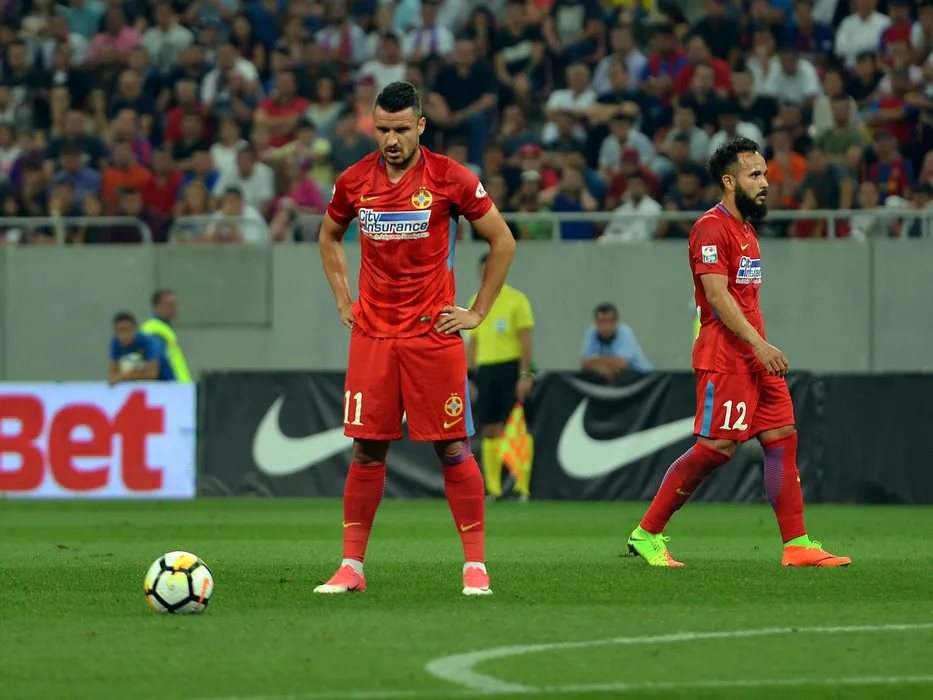 Constantin Budescu se pregateste sa execute o lovitura libera in meciul de fotbal dintre FCSB si FK Viktoria Plzen,din turul 3 preliminar al Ligii Campionilor, desfasurat marti 25 iulie 2017 pe Arena Nationala din Bucuresti.Razvan Pasarica/SPORT PICTURES