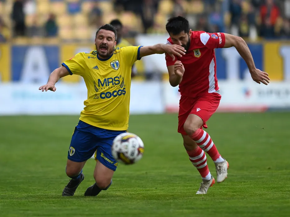 Ionut Georgian Burnea si Constantin Valentin Budescu in meciul de fotbal dintre Petrolul Ploiesti si CS Mioveni, contand pentru Play-out-ul Superligii Superbet, desfasurat pe Stadionul Ilie Oana din Ploiesti, luni 10 aprilie 2023. © FOTO:Razvan Pasarica/SPORT PICTURES