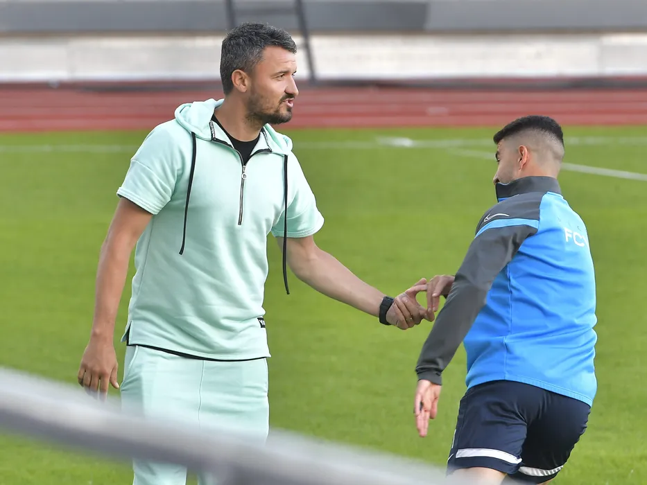 Constantin Valentin Budescu este salutat de catre George Cristian Merloi la antrenamentul oficial de dinaintea finalei Cupei Romaniei ce o vor disputa impotriva celor de la Sepsi OSK Sfantu Gheorghe, desfasurat la Stadionul Rapid din Bucuresti, miercuri 18 mai 2022. © FOTO:Razvan Pasarica/SPORT PICTURES