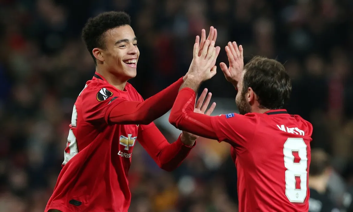 Mason Greenwood of Manchester United cele on his 2nd goal [4-0] with Juan Mata of Manchester United
