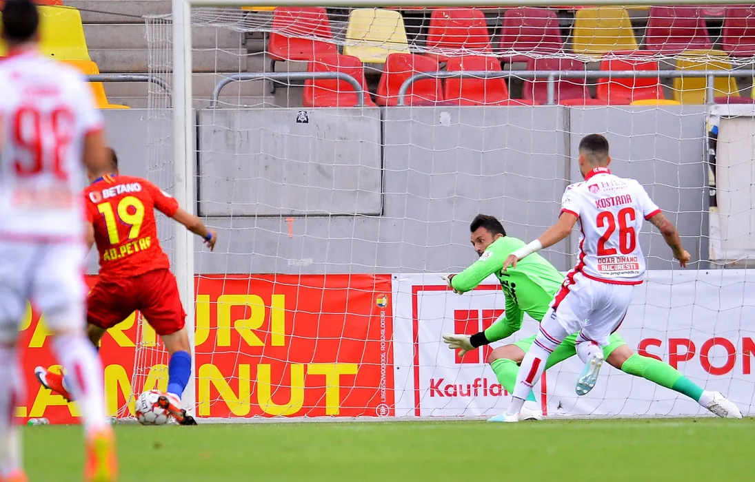 Adrian Petre (echipament rosu) marcheaza in poarta celor de la Dinamo Bucuresti (echipament alb-rosu) intr-o partida din mansa secunda a semifinalei Cupei Romaniei la fotbal, miercuri 8 iulie 2020, pe Arena Nationala din Bucuresti. ALEXANDRU DOBRE / MEDIAFAX FOTO