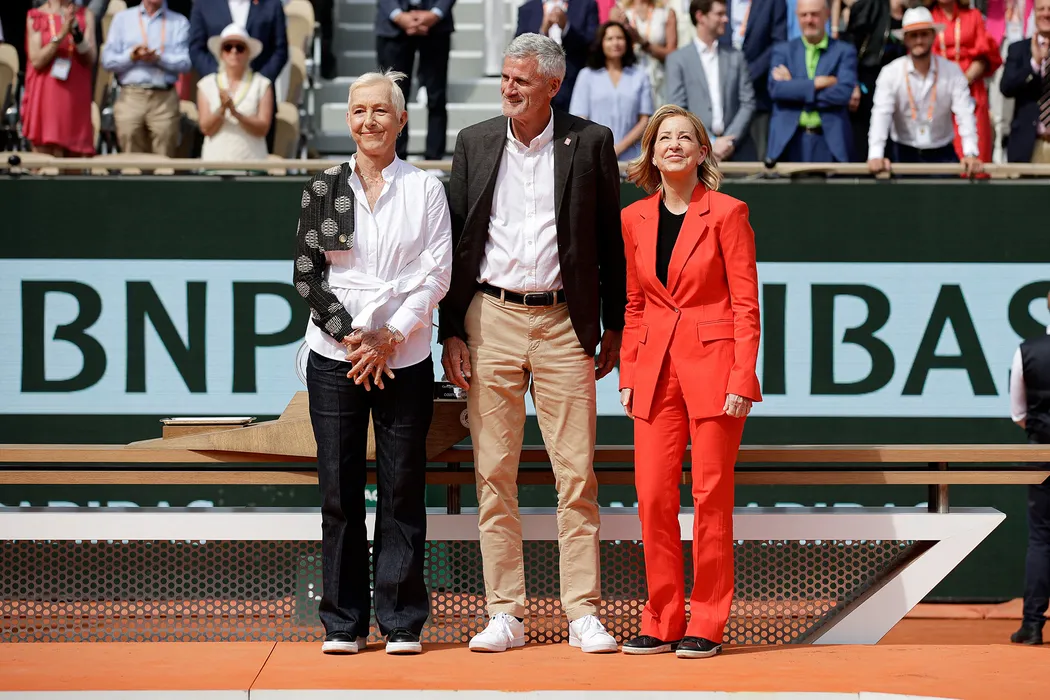 PARIS, FRANCE - JUNE 8: Former tennis players Martina Navratilova and Chris Evert and French Tennis Federation President Gilles Moretton are seen at the Women’s Singles Final match on day fourteen of the 2024 French Open at Roland Garros Complex in Paris, France on June 8, 2024. Antonio Borga / Anadolu/ABACAPRESS.COM