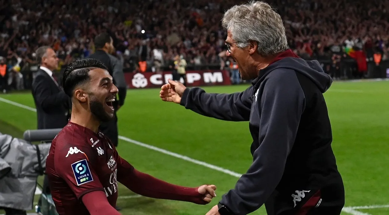 Metz’s Georgian forward Georges Mikautadze (L) celebrates with Metz's Romanian head coach Laszlo Boloni at the end of the French L2 football match between FC Metz and SC Bastia at Stade Saint-Symphorien in Longeville-Les-Metz, northeastern France, on June 2, 2023. Metz won 3-2 and will play in the French L1 next year.,Image: 781067578, License: Rights-managed, Restrictions: , Model Release: no