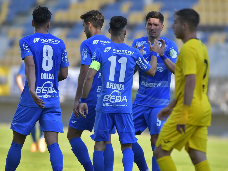 Bucurie a fotbalistilor targovisteni dupa un gol marcat de catre Daniel Constantin Florea cu Juan Pablo Passaglia si Daniel Marinel Celea in meciul de fotbal dintre Chindia Targoviste si Gaz Metan Medias, contand pentru Play-out-ul Ligii 1 Casa Pariurilor, desfasurat pe Stadionul Ilie Oana din Ploiesti, vineri 13 mai 2022. © FOTO:Razvan Pasarica/SPORT PICTURES