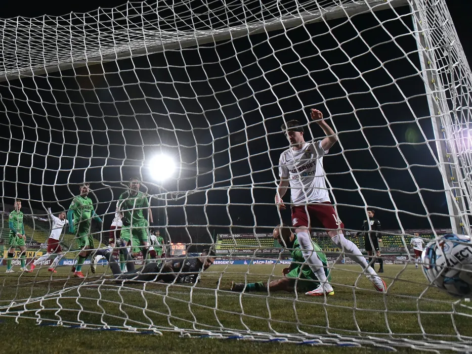 Mattias Kait marcheaza un gol in poarta lui Figueiredo Cristiano Pereira in meciul de fotbal dintre Rapid Bucuresti si Dinamo Bucuresti, contand pentru Play-out-ul Ligii 1 Casa Pariurilor, desfasurat pe Stadionul Orasenesc din Mioveni, duminica 13 martie 2022. © FOTO:Razvan Pasarica/SPORT PICTURES