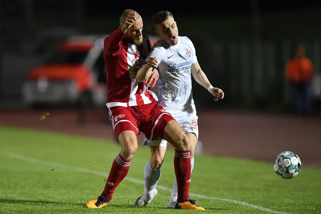 Darius Olaru (D), de la FCSB, lupta pentru balon cu Ninaj Branislav (S), de la Sepsi OSK, in meciul de fotbal din etapa 8 a play-off-ului Ligii 1, disputat pe stadionul Municipal din Sfantu Gheorghe, duminica, 16 mai 2021. ALEX NICODIM / MEDIAFAX FOTO