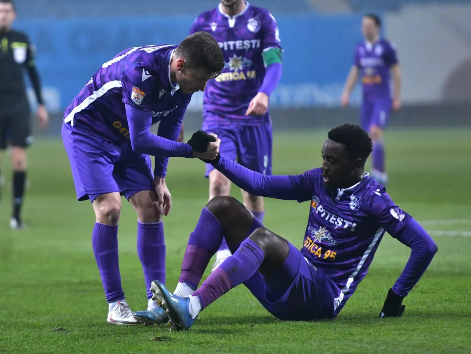 Nicolae Constantin Musat si Sylvain Boris Nabil Deslandes accidentat in meciul de fotbal dintre Universitatea Craiova si FC Arges, contand pentru Liga 1 Casa Pariurilor, desfasurat fara spectatori pe Stadionul Ion Oblemenco din Craiova, vineri 29 ianuarie 2021. © FOTO:Razvan Pasarica/SPORT PICTURES
