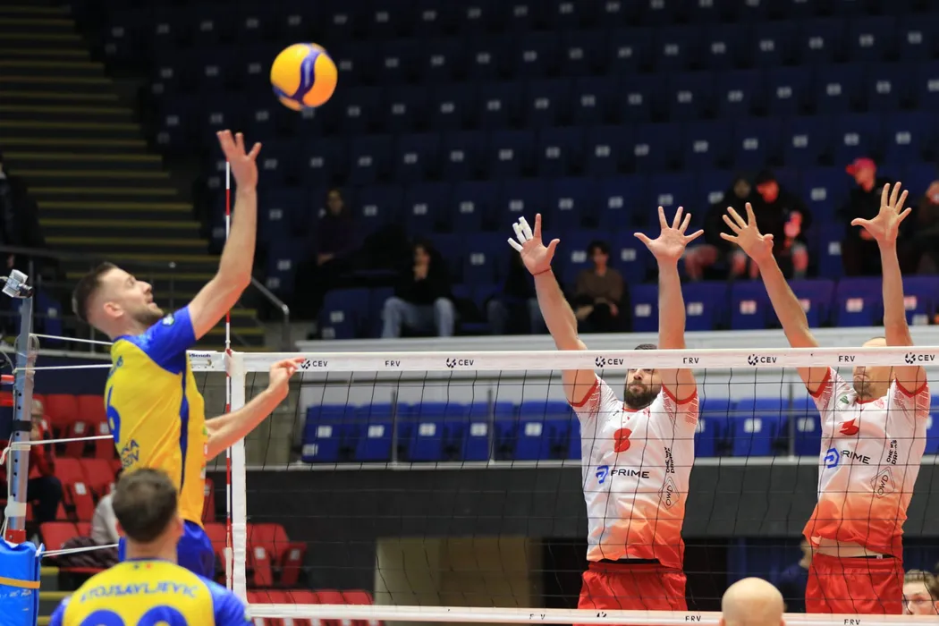Ewoud Gommans si Petar Premovic, Nicolae-Gabriel Ghionea in meciul de volei masculin dintre CS Dinamo Bucuresti si CSM Corona Brasov, contand pentru Finala Super Cupa Romaniei 25-26 Masculin, desfasurat in Sala Polivalenta Dinamo din Bucuresti, miercuri 3 decembrie 2025. © FOTO:Valentin Marian Burlacu/SPORT PICTURES