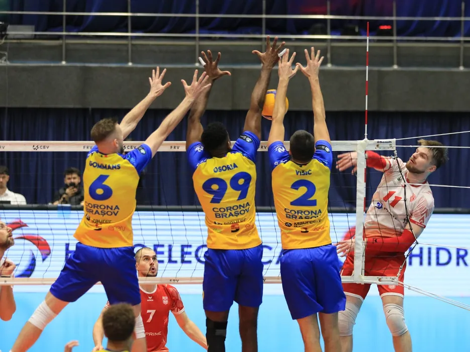Janis Eduards Medenis incearca sa sparga blocajul brasovean in meciul de volei masculin dintre CS Dinamo Bucuresti si CSM Corona Brasov, contand pentru Finala Super Cupa Romaniei 25-26 Masculin, desfasurat in Sala Polivalenta Dinamo din Bucuresti, miercuri 3 decembrie 2025. © FOTO:Valentin Marian Burlacu/SPORT PICTURES