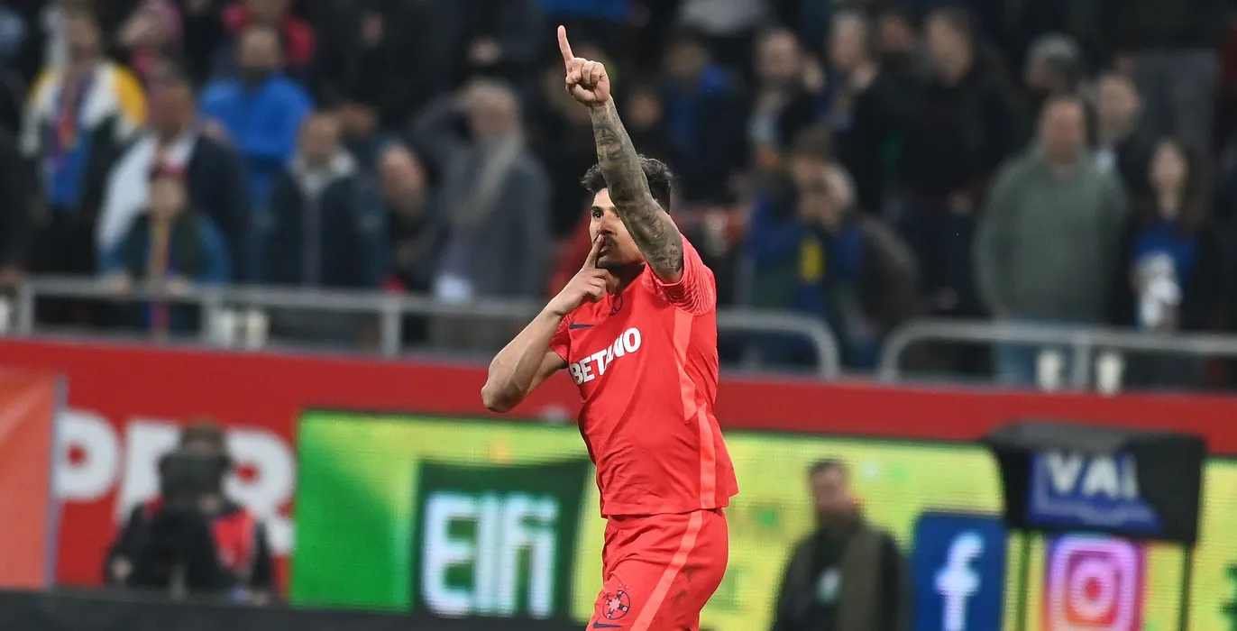 Florinel Teodor Coman se bucura dupa un gol marcat in meciul de fotbal dintre FCSB si CFR Cluj, contand pentru Play-off-ul Superligii Superbet, desfasurat pe Arena Nationala din Bucuresti, duminica 14 mai 2023. © FOTO:Razvan Pasarica/SPORT PICTURES