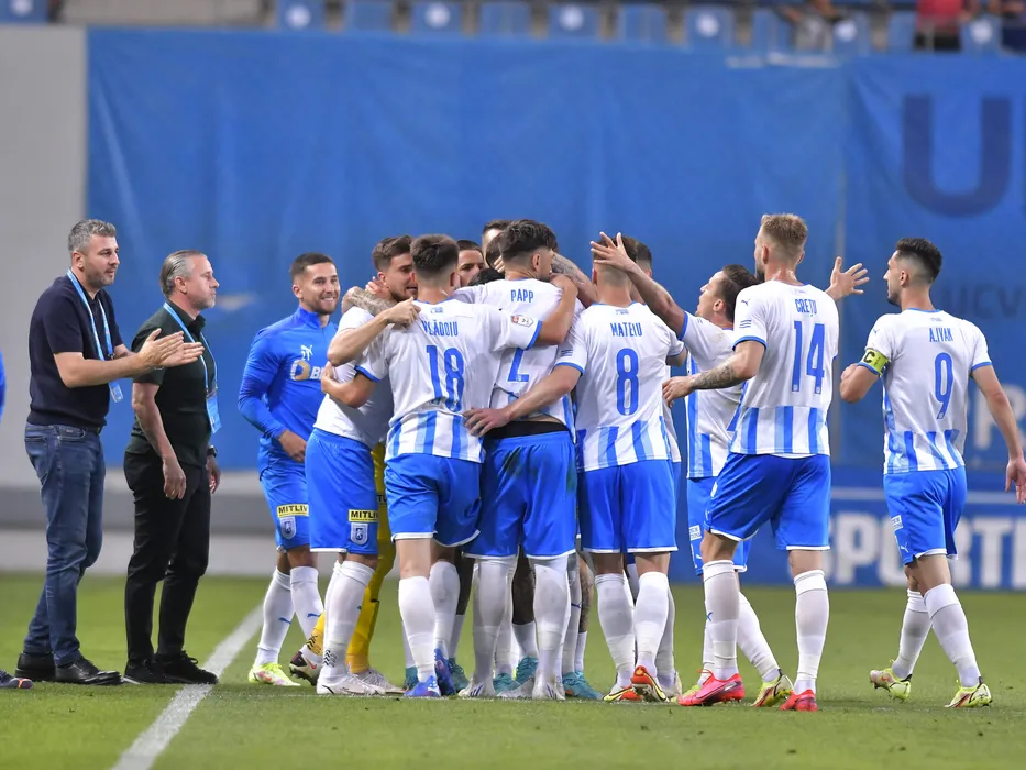Bucurie a fotbalistilor craioveni dupa un gol marcat cu Ovidiu Alexandru Bic, Mihai Cristian Capatina si Andrei Virgil Ivan alaturi de Laurentiu Aurelian Reghecampf si Emil Pieleanu in meciul de fotbal dintre Universitatea Craiova si FC Botosani, contand pentru Barajul Europa Conference League, desfasurat pe Stadionul Ion Oblemenco din Craiova, vineri 27 mai 2022. © FOTO:Razvan Pasarica/SPORT PICTURES