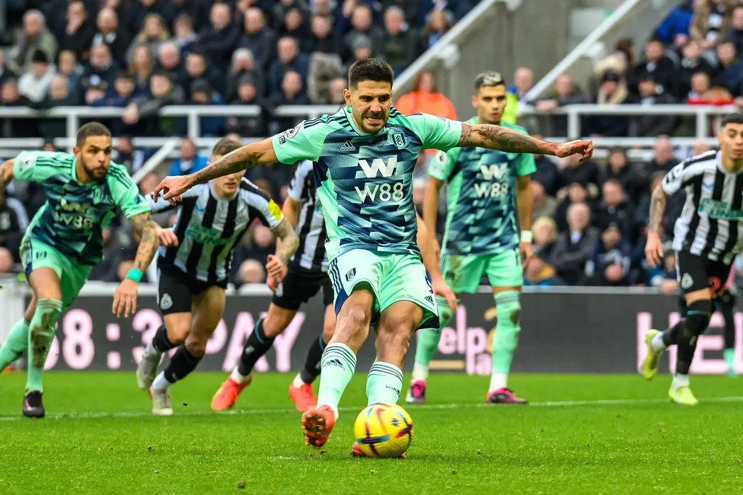 PENALTY Fulham's Aleksandar Mitrovic takes a penalty, only to see it disallowed after he allegedly kicked the ball twice during the Premier League match between Newcastle United and Fulham at St. James' Park, Newcastle