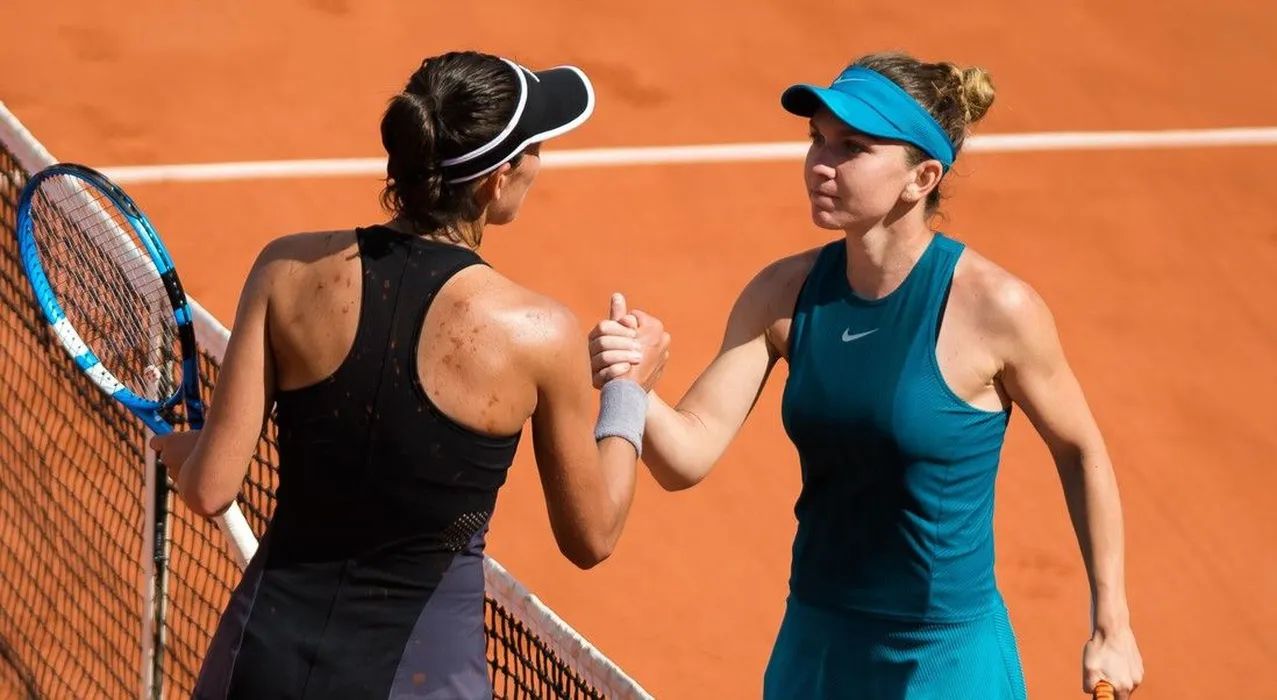 Garbine Muguruza of Spain, Simona Halep of Romania in action during the semi-final of the 2018 Roland Garros Grand Slam tennis tournament