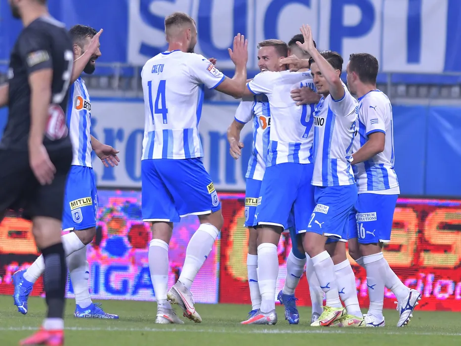Nicusor Silviu Bancu se bucura dupa un gol marcat alaturi de Gustavo Vagenin in meciul de fotbal dintre Universitatea Craiova si Academica Clinceni, contand pentru Liga 1 Casa Pariurilor, desfasurat pe Stadionul Ion Oblemenco din Craiova, luni 18 octombrie 2021. © FOTO:Razvan Pasarica/SPORT PICTURES