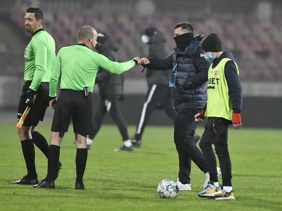 Cosmin Contra ii saluta pe arbitrii Daniel Mitruti si Marius Avram dupa meciul de fotbal dintre Dinamo Bucuresti si Viitorul Constanta, contand pentru Cupa Romaniei, desfasurat fara spectatori pe Stadionul Dinamo din Bucuresti, sambata 28 noiembrie 2020. © FOTO:Razvan Pasarica/SPORT PICTURES