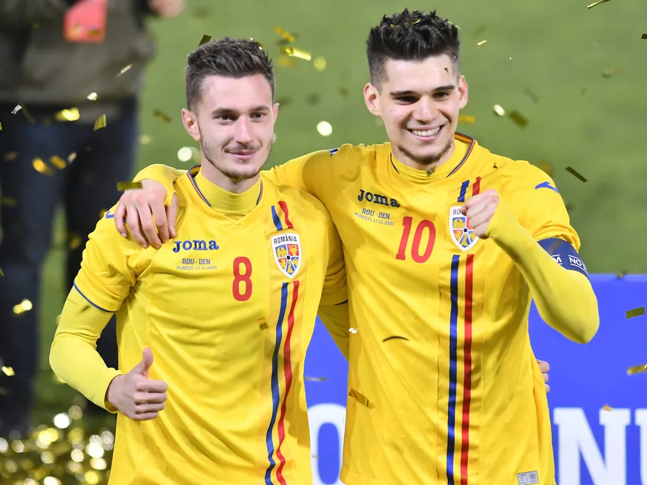 Fotbalistii romani Carlo Casap si Ianis Hagi se bucura dupa calificarea la Campionatul European din 2021, in urma meciului de fotbal dintre Romania U21 si Danemarca U21, desfasurat fara spectatori pe Stadionul Ilie Oana din Ploiesti, marti 17 noiembrie 2020. © FOTO:Razvan Pasarica/SPORT PICTURES