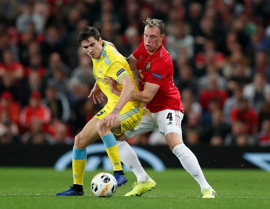 Phil Jones of Manchester United holds onto Dorin Rotariu of FC Astana during the UEFA Europa League match at Old Trafford, Manchester. Picture date: 19th September 2019. Picture credit should read: Darren Staples/Sportimage via PA Images,Image: 471983324, License: Rights-managed, Restrictions: RESTRICTIONS: Use subject to restrictions. Editorial use only. Book and magazine sales permitted providing not solely devoted to any one team / player / match. No commercial use. Call +44 (0)1158 447447 for further information., Model Release: no, Credit line: Profimedia