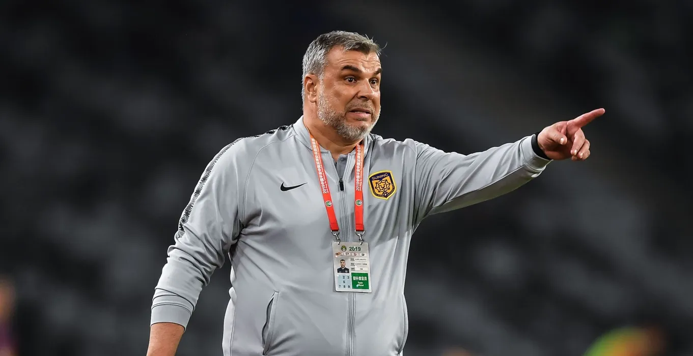 Head coach Cosmin Olaroiu of Jiangsus Suning F.C. reacts as he watches his players competing against Shenzhen F.C. in their 5th round match during the 2019 Chinese Football Association Super League (CSL) in Shenzhen city, south China's Guangdong province, 13 April 2019.