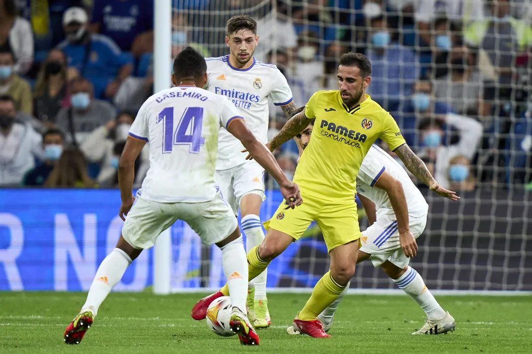 MADRID, SPAIN - SEPTEMBER 25: Federico Valverde of Real Madrid CF battle for the ball with Paco Alcacer of Villarreal CF during the La Liga Santander match between Real Madrid CF and Villarreal CF (Photo by Diego Souto/Quality Sport Images/Getty Images)