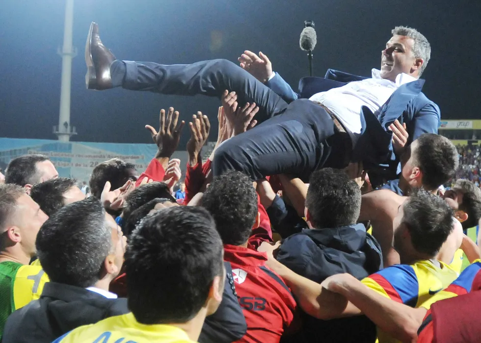 Cosmin Olaroiu purtat pe brate de elevii sai.