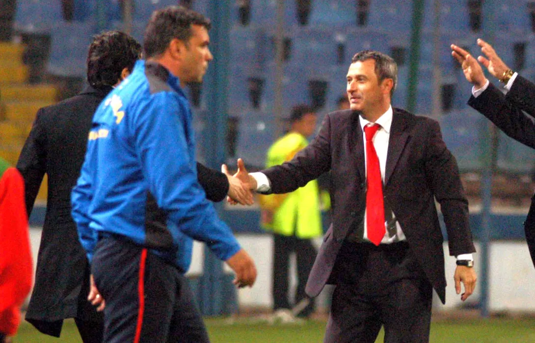 Managerul general al Stelei Mihai Stoica,mascat de antrenorul Cosmin Olaroiu,il felicita la final pe antrenorul dinamovist Mircea Rednic.