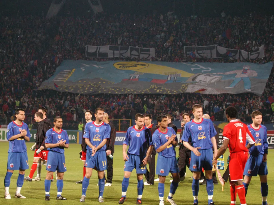 Fotbalistii stelisti isi saluta adversarii inaintea meciului de fotbal dintre Steaua Bucuresti si Middlesbrough FC, contand pentru semifinala tur a Cupei UEFA, desfasurat pe Stadionul National din Bucuresti, joi 20 aprilie 2006. © FOTO:Razvan Pasarica/SPORT PICTURES