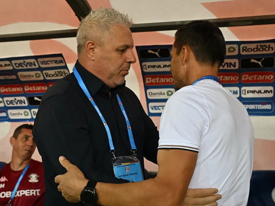 Antrenorii celor doua echipe Marius Sumudica si Constantin Galca se saluta inaintea meciului dintre Universitatea Craiova si Rapid Bucuresti, contand pentru Superliga Superbet, desfasurat pe Stadionul Ion Oblemenco din Craiova, sambata 31 august 2024. © FOTO:Razvan Pasarica/SPORT PICTURES