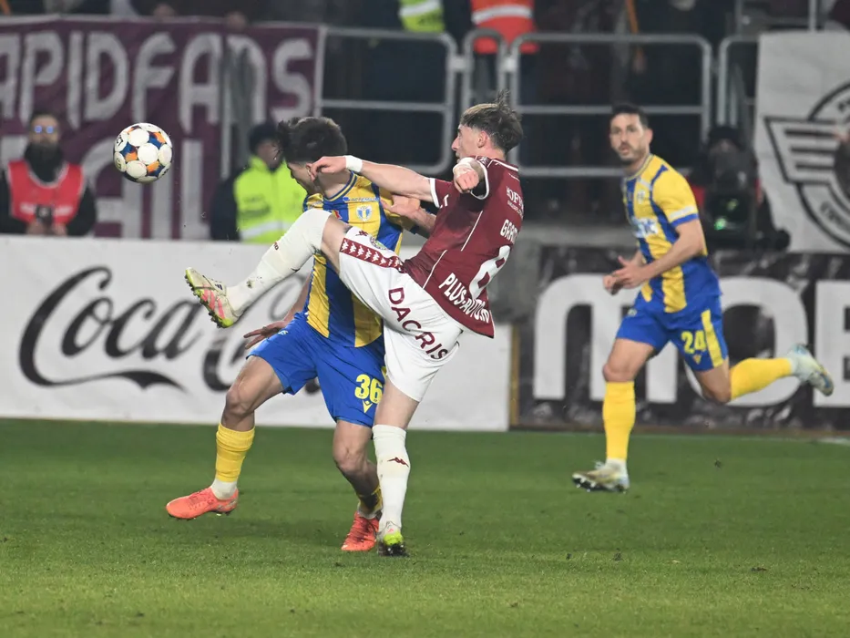 Alin Marius Botogan si Constantin Grameni in meciul de fotbal dintre Rapid Bucuresti si Petrolul Ploiesti, din cadrul Superligii Superbet, desfasurat pe Superbet Arena-Giulesti din Bucuresti, vineri 6 februarie 2026. © FOTO:Razvan Pasarica/SPORT PICTURES