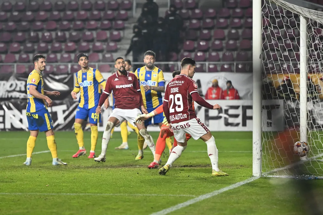 Miranda Ricardo Jose Veiga Varzim, Alin Marius Botogan, Leonardo Da Costa Bolgado, Paul Papp si Mihai Alexandru Dobre la faza golului rapidist reusit in meciul de fotbal dintre Rapid Bucuresti si Petrolul Ploiesti, din cadrul Superligii Superbet, desfasurat pe Superbet Arena-Giulesti din Bucuresti, vineri 6 februarie 2026. © FOTO:Razvan Pasarica/SPORT PICTURES