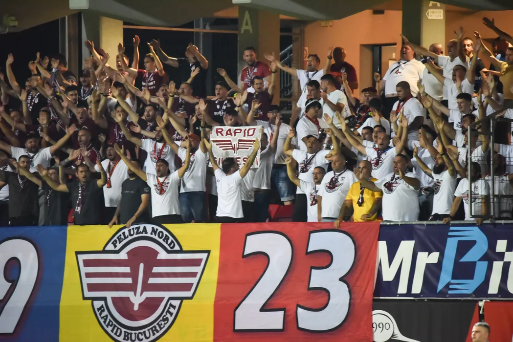 Galeria rapidista isi incurajeaza favoritii in meciul de fotbal dintre FK Csikszereda Miercurea Ciuc si FC Rapid Bucuresti, contand pentru Superliga Superbet, desfasurat pe Stadionul Municipal din Miercurea Ciuc, vineri 25 iulie 2025. © FOTO:Zoltan Pal/SPORT PICTURES