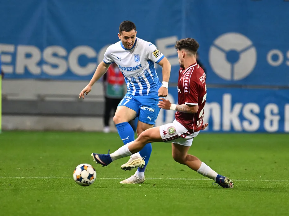 Carlos Andrei Mora Montoya si Sebastian Andrei Borza in meciul dintre Universitatea Craiova si Rapid Bucuresti, contand pentru Play off-ul Superligii Superbet, desfasurat pe Stadionul Ion Oblemenco din Craiova, duminica 19 aprilie 2026. © FOTO:Razvan Pasarica/SPORT PICTURES