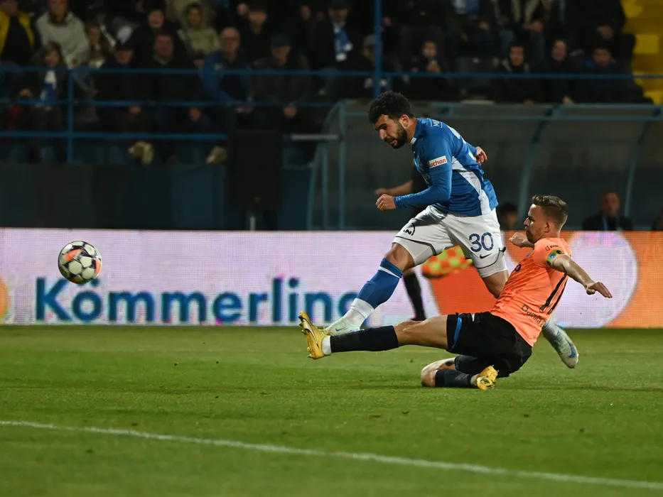 Narek Grigoryan marchează un gol de lângă Nicușor Silviu Bancu in meciul de fotbal dintre Farul Constanta si Universitatea Craiova, contand pentru Superliga Superbet, desfasurat pe Stadionul central al Academiei Gheorghe Hagi din Ovidiu, luni 28 octombrie 2024. © FOTO:Razvan Pasarica/SPORT PICTURES