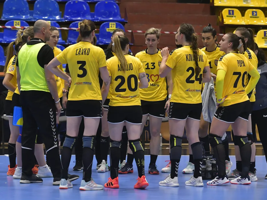 Costica Buceschi la un timeout alaturi de handbalistele baimarene printre care Cristina Laslo, Andreea Cristina Popa si Jovana Kovacevic in meciul de handbal feminin dintre Dacia Mioveni si Minaur Baia Mare, contand pentru Liga Florilor, desfasurat fara spectatori in Sala Traian din Ramnicu Valcea, marti 9 martie 2021. © FOTO:Razvan Pasarica/SPORT PICTURES