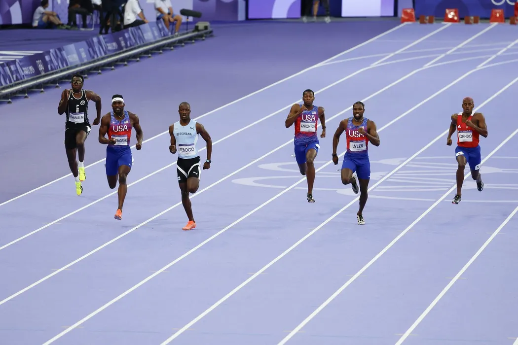 Epreuves d'athlétisme lors des jeux olympiques Paris 2024 (JO 2024) le 8 août 2024. Gregory Lenormand / Panoramic / Bestimage TEBOGO Letsile of Botswana, BEDNAREK Kenneth of United States of America, LYLES Noah of United States of America Athletics Men's 200m Final during the Olympic Games Paris 2024 on 8 August 2024 at State de France in Saint Denis, France - Photo Gregory Lenormand / DPPI Media / Panoramic,Image: 897266267, License: Rights-managed, Restrictions: , Model Release: no