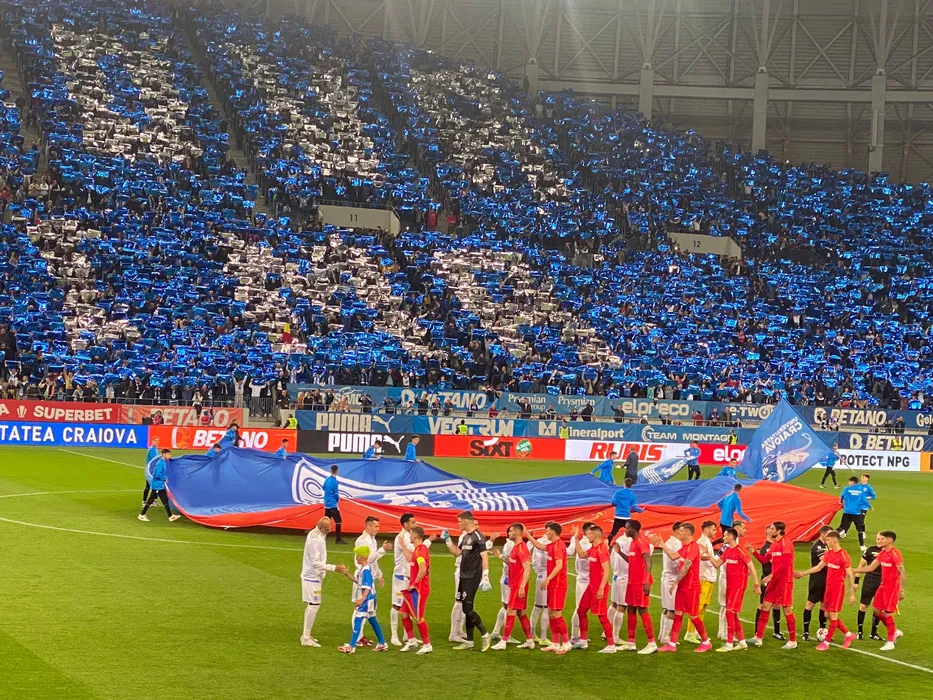 „Craiova Maxima”, sărbătorită înainte de Universitatea Craiova – FCSB! Coregrafie de senzație și show pirotehnic incendiar, care a întrerupt meciul pentru câteva minute! GALERIE FOTO