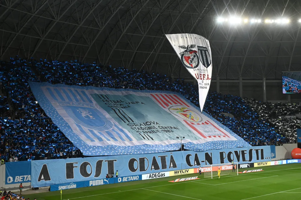 Supercoregrafie craioveana cu trimitere la celebrul meci impotriva Benficai Lisabona disputat in 1983, realizata inaintea meciului de fotbal dintre Universitatea Craiova si FCSB, contand pentru Play-off-ul Superligii Superbet, desfasurat pe Stadionul Ion Oblemenco din Craiova, duminica 30 aprilie 2023. © FOTO:Razvan Pasarica/SPORT PICTURES