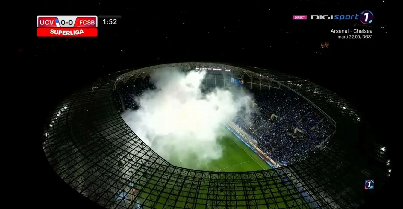 „Craiova Maxima”, sărbătorită înainte de Universitatea Craiova – FCSB! Coregrafie de senzație și show pirotehnic incendiar, care a întrerupt meciul pentru câteva minute! GALERIE FOTO