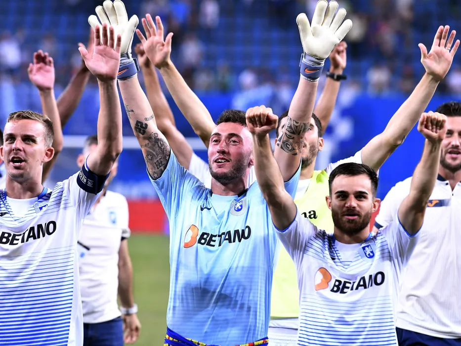 Nicusor Bancu,Mirko Pigliacelli si Cristi Barbut se bucura dupa meciul de fotbal dintre Universitatea Craiova si Honved Budapesta, din cadrul Ligii Europa, desfasurat pe Stadionul Ion Oblemenco din Craiova, joi 1 august 2019. © FOTO:Razvan Pasarica/SPORT PICTURES