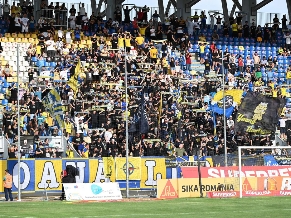 Suporterii ploiesteni isi incurajeaza favoritii la meciul de fotbal dintre Petrolul Ploiesti si Farul Constanta, din cadrul Superligii Superbet, desfasurat pe Stadionul Ilie Oana din Ploiesti, duminica 6 august 2023. © FOTO:Razvan Pasarica/SPORT PICTURES