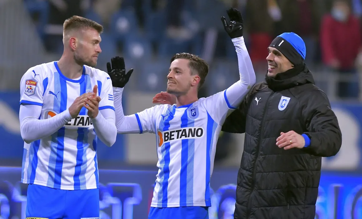 Fotbalistii craioveni Alexandru Cretu, Gustavo Vagenin si David Beniamin Lazar se bucura dupa meciul de fotbal dintre Universitatea Craiova si CFR Cluj, contand pentru Liga 1 Casa Pariurilor, desfasurat pe Stadionul Ion Oblemenco din Craiova, sambata 5 februarie 2022. © FOTO:Razvan Pasarica/SPORT PICTURES