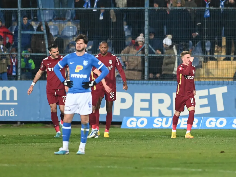 Claudiu Adrian Mihai Petrila se bucura dupa un gol marcat sub privirile lui Karlo Muhar si Rangelo Maria Janga in meciul de fotbal dintre Farul Constanta si CFR Cluj, contand pentru Superliga Superbet, desfasurat pe Stadionul central al Academiei Gheorghe Hagi din Ovidiu, luni 23 ianuarie 2023. © FOTO:Razvan Pasarica/SPORT PICTURES
