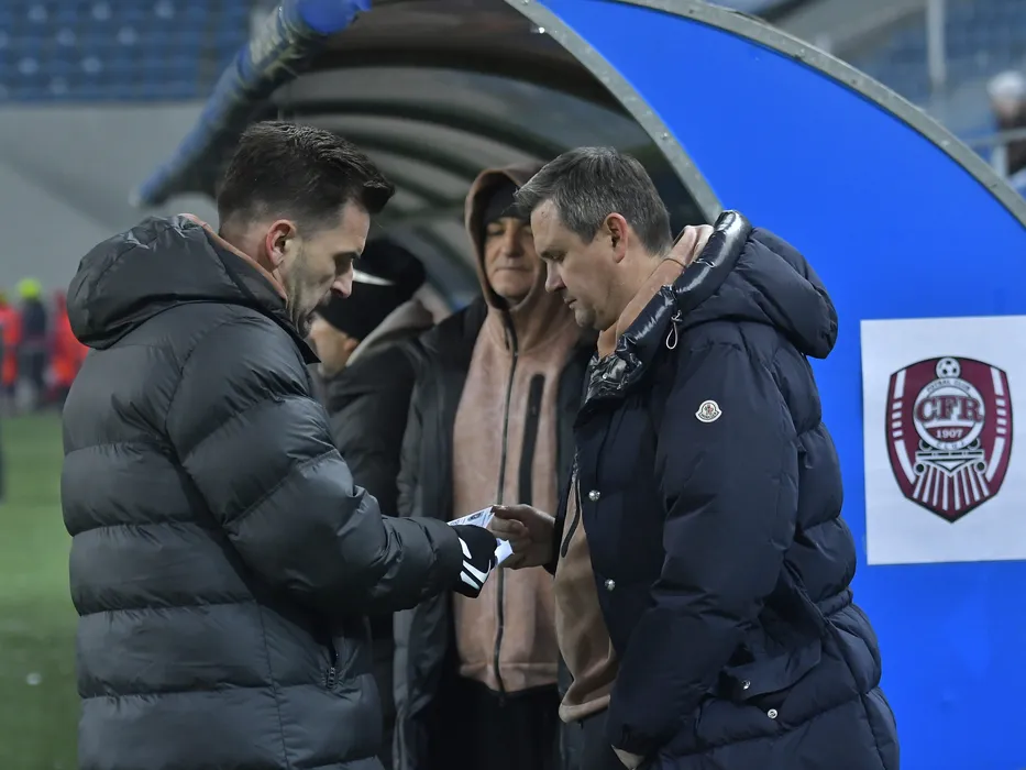 Marius Bilasco discuta cu Cristi Balaj inaintea meciului de fotbal dintre Universitatea Craiova si CFR Cluj, contand pentru Superliga Superbet, desfasurat pe Stadionul Ion Oblemenco din Craiova, sambata 11 februarie 2023. © FOTO:Razvan Pasarica/SPORT PICTURES