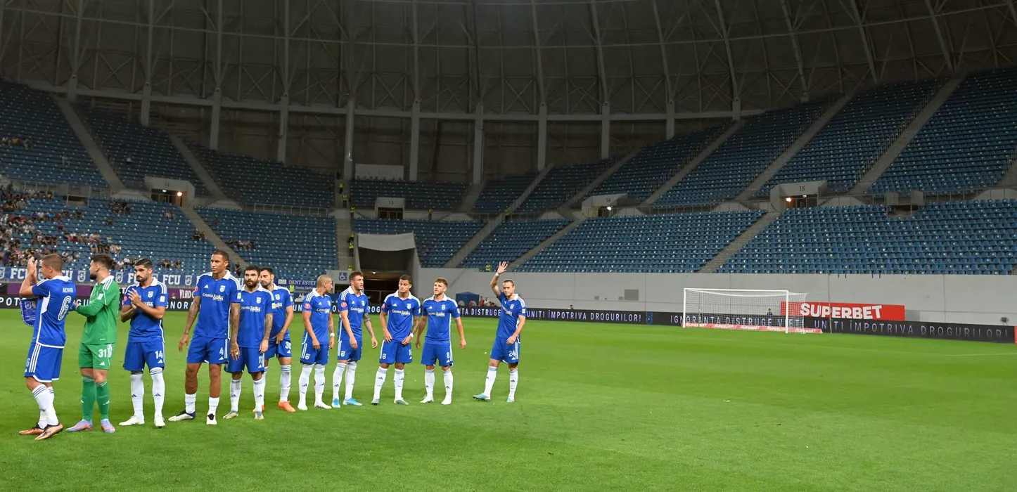 Fotbalistii craioveni alaturi de peluza fara suporteri la startul meciului de fotbal dintre FC U Craiova si Farul Constanta, contand pentru Superliga Superbet, desfasurat pe Stadionul Ion Oblemenco din Craiova, duminica 3 septembrie 2023. © FOTO:Razvan Pasarica/SPORT PICTURES