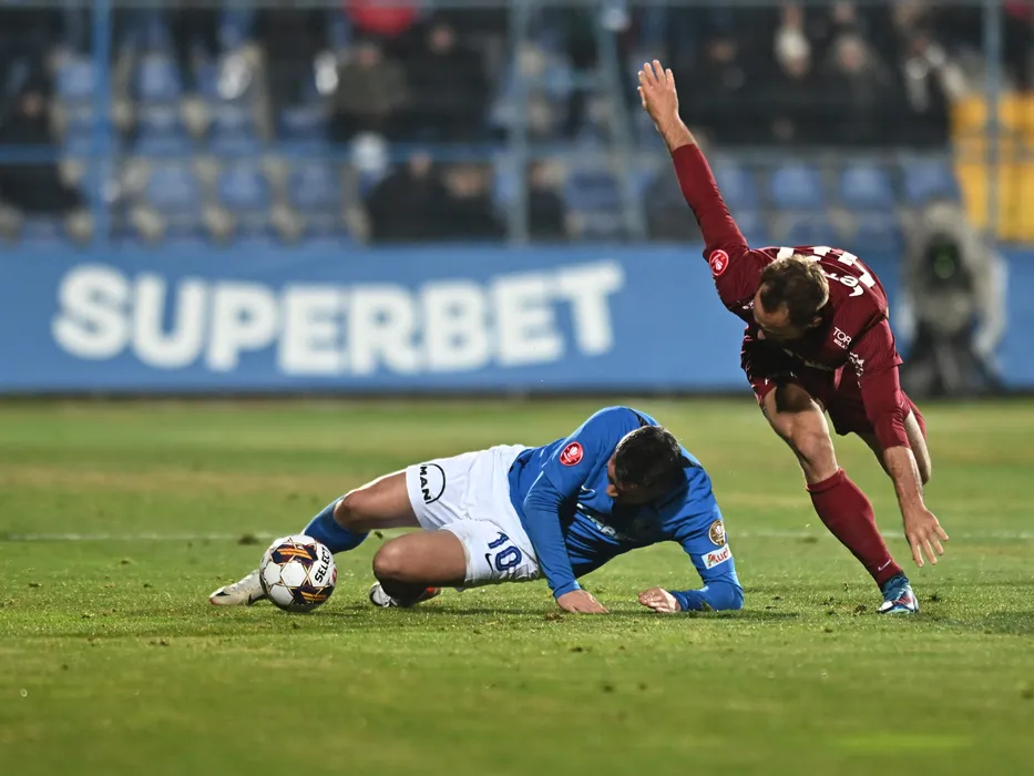 Constantin Valentin Budescu si Matija Boben în meciul de fotbal dintre Farul Constanta si CFR Cluj, contând pentru Superliga Superbet, desfășurat pe Stadionul central al Academiei Gheorghe Hagi din Ovidiu, sambata 2 martie 2024. © FOTO: Răzvan PĂSĂRICĂ/SPORT PICTURES