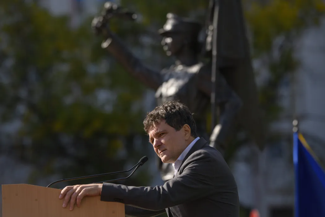 Primarul Capitalei, Nicusor Dan, sustine un discurs in timpul ceremoniei de dezvelire a monumentului de for public Eroina de la Jiu slt. Ecaterina Teodoroiu, in Bucuresti, miercuri, 18 octombrie 2023. ALEXANDRU DOBRE/ MEDIAFAX FOTO.