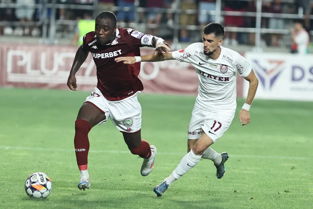 Christopher Braun și Meriton Korenica în meciul de fotbal dintre FC Rapid 1923 București și FC CFR 1907 Cluj, contând pentru Superliga Superbet, desfășurat pe Stadionul Superbet Arena - Giulești din București, sâmbătă 20 iulie 2024. © FOTO: Gică FLUȘTER/SPORT PICTURES