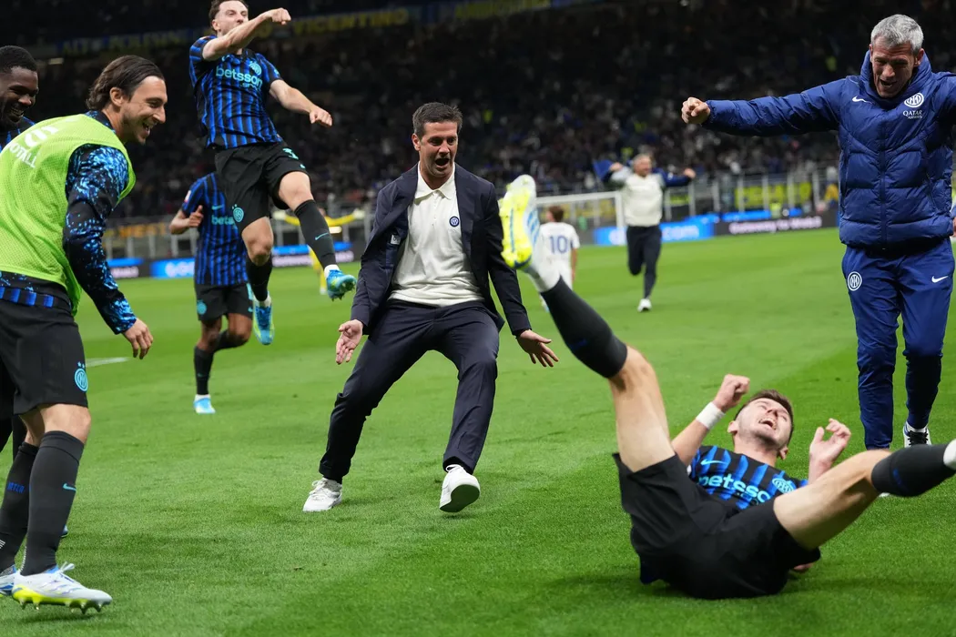 Inter Milan's head coach Cristian Chivu celebrates after Inter Milan's Petar Sucic scored his side's third goal during the Italian Cup, return-leg soccer match between Inter Milan and Como, in Milan, Italy, Tuesday, April 21, 2026.,Image: 1093378814, License: Rights-managed, Restrictions: This content is intended for editorial use only. For other uses, additional clearances may be required., Model Release: no, Pictured: Cristian Chivu,Petar Sucic, Credit line: Luca Bruno / AP / Profimedia