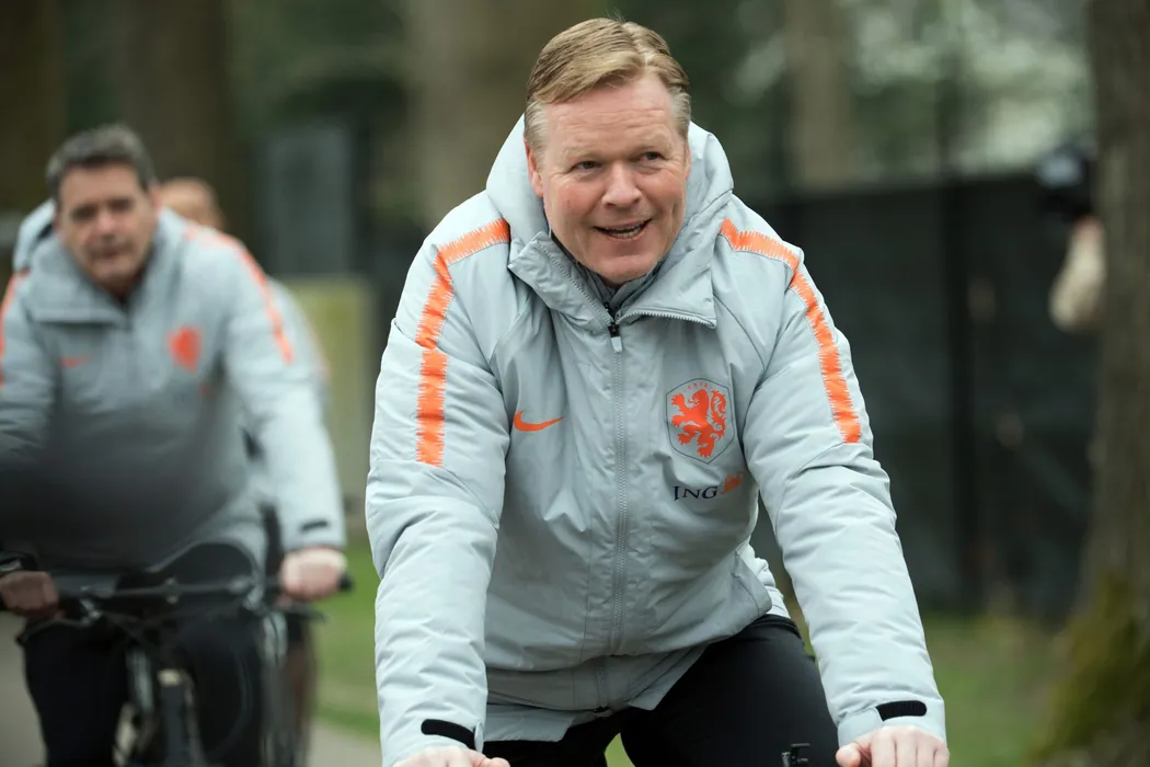 23 March 2019, Netherlands, Zeist: Netherlands manager Ronald Koeman leads a training session on bicycles for Netherlands national soccer team ahead of Sunday's UEFA European Championship Qualifying soccer match against Germany. Photo: Federico Gambarini/dpa