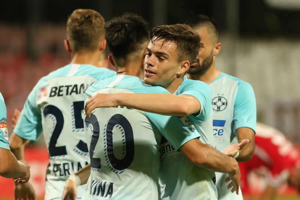 Cristian Dumitru (C) de la FCSB este felicitat de coechipieri dupa ce a marcat impotriva echipei Dinamo, intr-o partida din turul semifinalelor Cupei Romaniei la fotbal, joi 25 iunie 2020, pe stadionul din Stefan cel Mare din Bucuresti. GEORGE FUSTER / MEDIAFAX FOTO